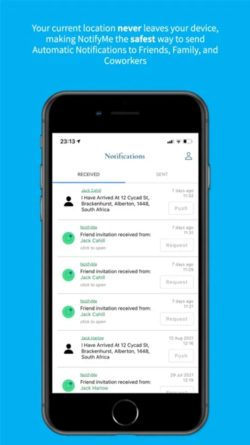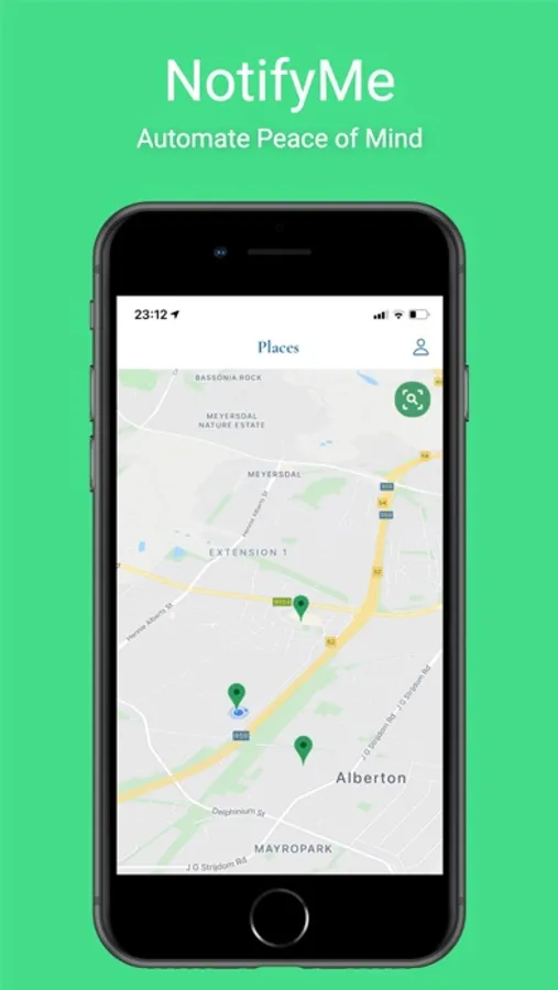 NotifyMe safely and securely uses your current location to send notifications to the friends you selected when you arrive safely at locations that you have saved.