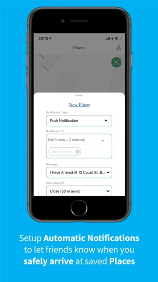 Setup notifications so that you can automatically let family, friends, and work colleagues know when you arrive safely at certain locations.