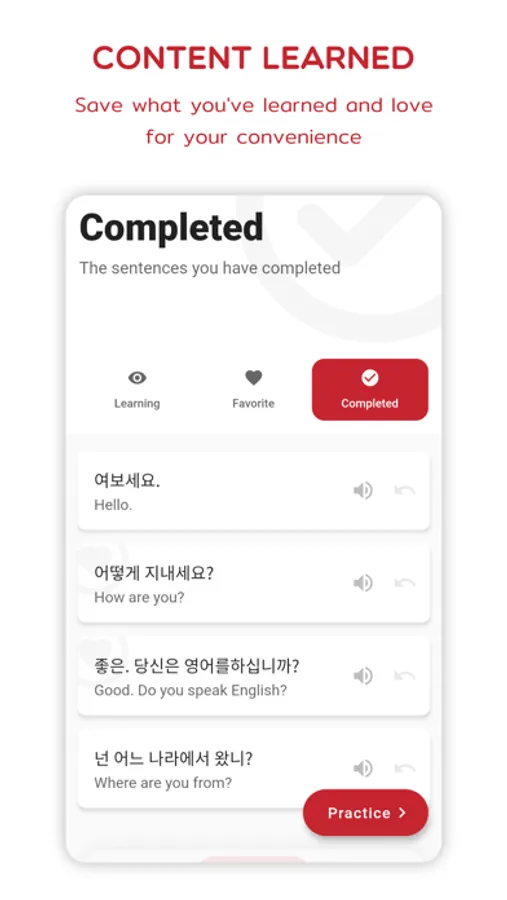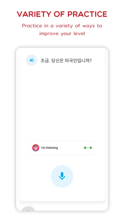 With Korean Speak & Listen, you have access to a vast collection of familiar Korean phrases, featuring over 9999 sentences and phrases covering various categories and relevant topics. Our app provides an easy and effective method for you to become a native Korean speaker. Simply listen and repeat, and then record your speech to compare it with the app's native Korean speakers. Repeat this process over and over again while tracking your progress with our supported tools, and you'll see the difference in just a few days.