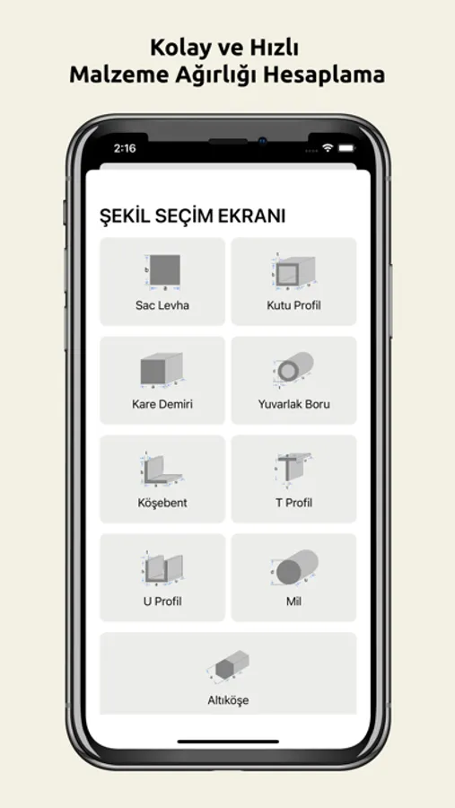 Kolay kullanımı sayesinde basit bir şekilde malzeme seçimi ve şekil seçimi yaparak hesaplama formu ekrana getirilir. Özelleştirilmiş form içerisinde gerekli bilgileri mm cinsinden seçerek "hesapla" tuşuna basılır ve uygulama hesaplama sonucunu ekrana getirir.
