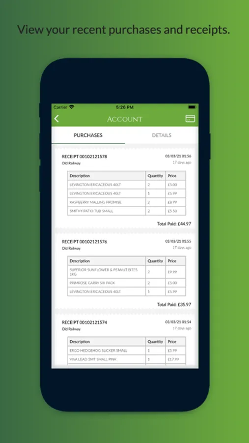 * View your recent purchases and receipts. No need to worry next time you misplace your paper copy of your receipt!