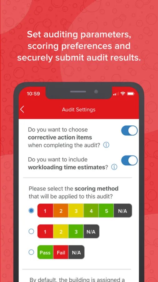 - Set auditing parameters, scoring preferences and securely submit audit results to admin site
