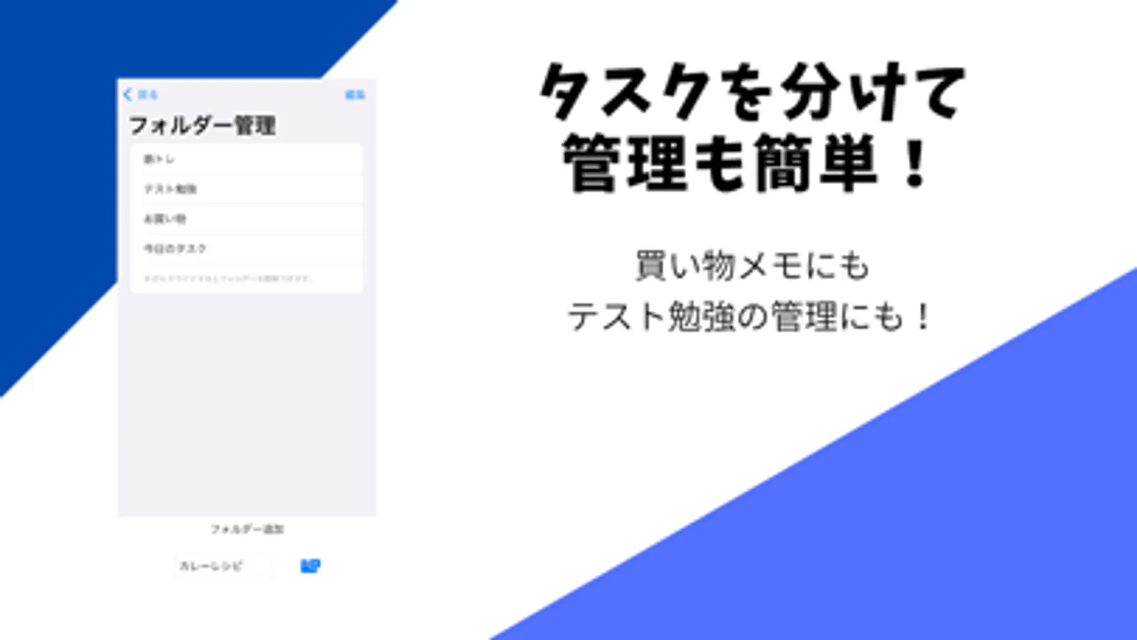 ・ You can set folders such as "Shopping", "○ month x day work", and "study for final exam".
