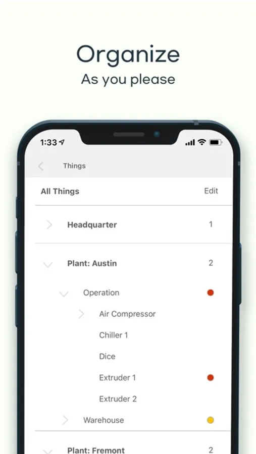 You can organize your assets into hierarchical groups and labels based on regions, teams, parts, or any categories that make sense to your organization. It’s easy to change and modify the structure. Because you can customize the organizational structure, it’s intuitive and easy to use.