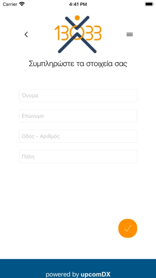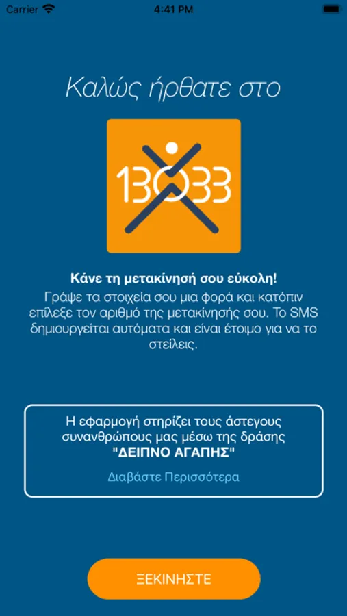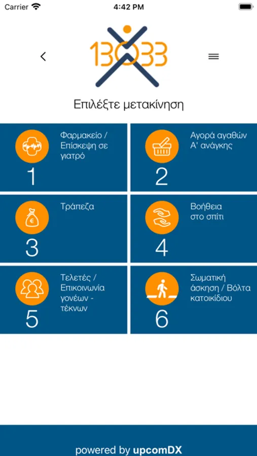 Όλοι μαζί μπορούμε να κάνουμε έναν καλύτερο κόσμο! Η εφαρμογή “UPCOM-13033”. αποθηκεύει τα προσωπικά στοιχεία του κατόχου (ονοματεπώνυμο καιΔιεύθυνση) και αποστέλλει το SMS μετακίνησης μέσα από τις επιλογές 1 έως 6όπως ορίζεται από το σχετικές διατάξεις, χωρίς κάθε φορά να πρέπει ναγράφουμε τα ίδια στοιχεία. Στα χαρακτηριστικά της εφαρμογήςσυμπεριλαμβάνεται και το ιστορικό μετακινήσεων του χρήστη. Η εταιρείαUPCOM με την διάθεση της εφαρμογής στηρίζει την εθελοντική ομάδα «ΔΕΙΠΝΟΑΓΑΠΗΣ» προσφέροντας κατ’ ελάχιστο 1000 γεύματα σε άστεγουςσυνανθρώπους μας στην Αθήνα. Η εφαρμογή παρέχεται δωρεάν. Η αποστολή τουSMS πραγματοποιείται μέσω του παρόχου σας σύμφωνα με τις ισχύουσεςδιατάξεις