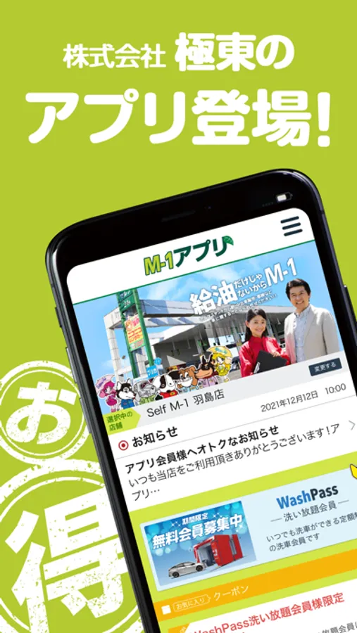 当社の公式アプリ「M-1アプリ」ではWashPass(セルフ洗車機 洗い放題会員)のお申し込み・お支払い・ご利用いただけます。