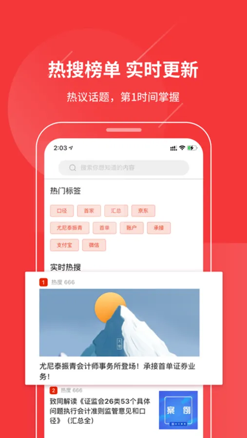 发现热搜,每天实时更新热点事件,按照资讯的热度排行,快速了解当日新热会计事;