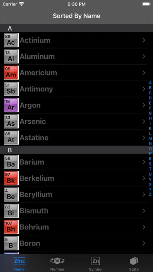 List all the chemical elements, sort by element name. atomic number, ISO symbol or by natural state. A fun way to learn the table of elements