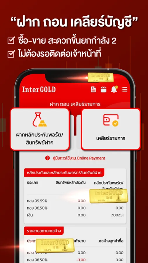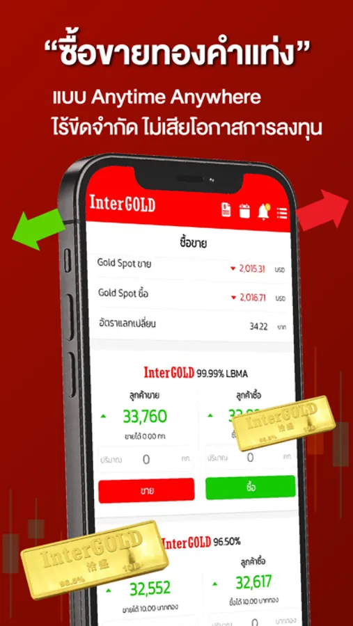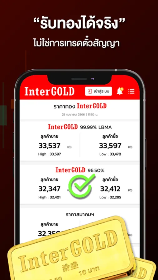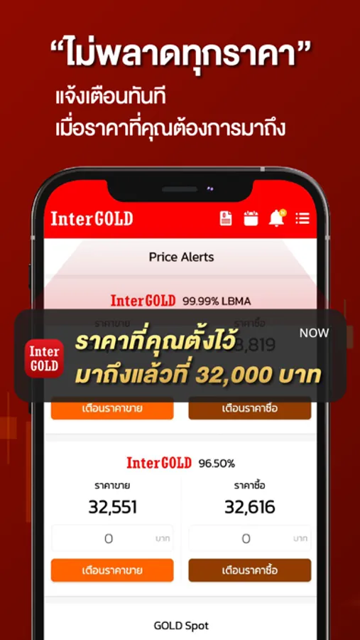 เปิดประสบการณ์ การซื้อขายทองคำรูปแบบใหม่จากอินเตอร์โกลด์ ไม่ต้องรอหน้าร้าน ไม่ต้องต่อคิว พร้อมระบบแจ้งเตือนราคา ไม่พลาดทุกการซื้อขาย ให้คุณซื้อขายได้ทุกที่ ทุกเวลา ด้วยฟังก์ชันหลักที่จะทำหน้าที่เป็นผู้ช่วยคุณตลอดการลงทุน