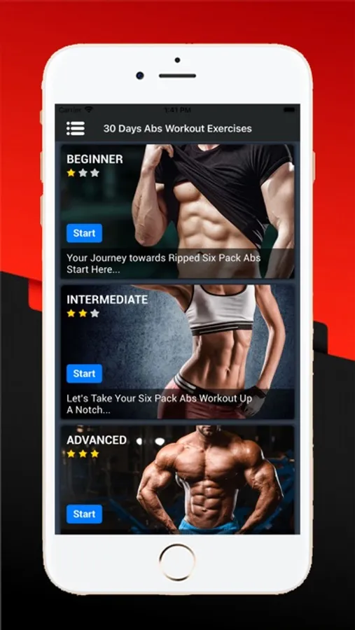 - 30 Days abs workout exercise application has three six pack abs workout plans. Namely Beginner, Intermediate and Advanced.