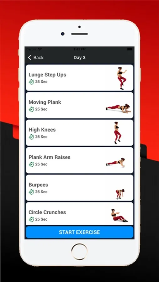 - Every exercise will start with specific time then after you will get few second rest time then after next exercise will start.