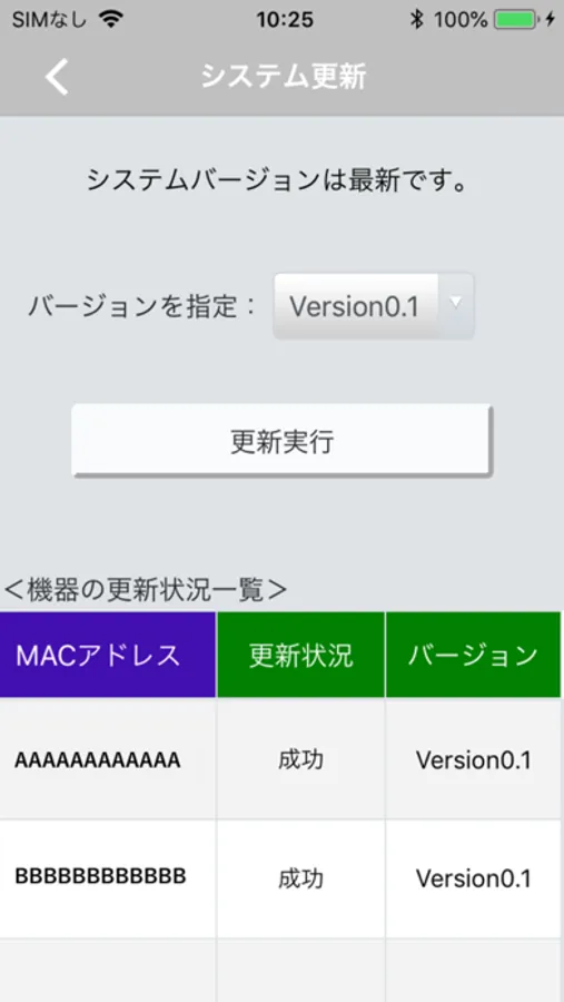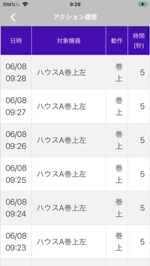 日時・対象機器・動作・時間(秒)のデータを最新のものから順に表示します。