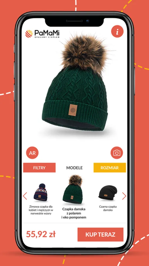 Kupowanie ubrań przez internet prawie zawsze wiąże się z pytaniem, czy dana rzecz będzie na nas wyglądać tak samo jak na modelu czy modelce? W przypadku naszych czapek nie musisz się już zastanawiać! Pobierz apliakcję PaMaMi - Fit It i zobacz jak wyglądasz w różnych modelach i wersjach kolorystycznych! Dowolnie zmieniaj rozmiar i dopasowuj czapkę na głowie, zapisuj zdjęcia w urządzeniu i dziel się nimi przez internet :) Możesz również dokładnie obejrzeć każdy produkt korzystając z funkcji obrazu 3D, a jeśli uznasz, że w którymś z produktów wyglądasz rewelacyjnie, skorzystaj z przycisku "Kup teraz" :)