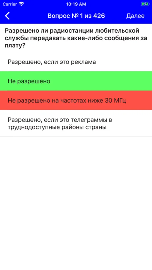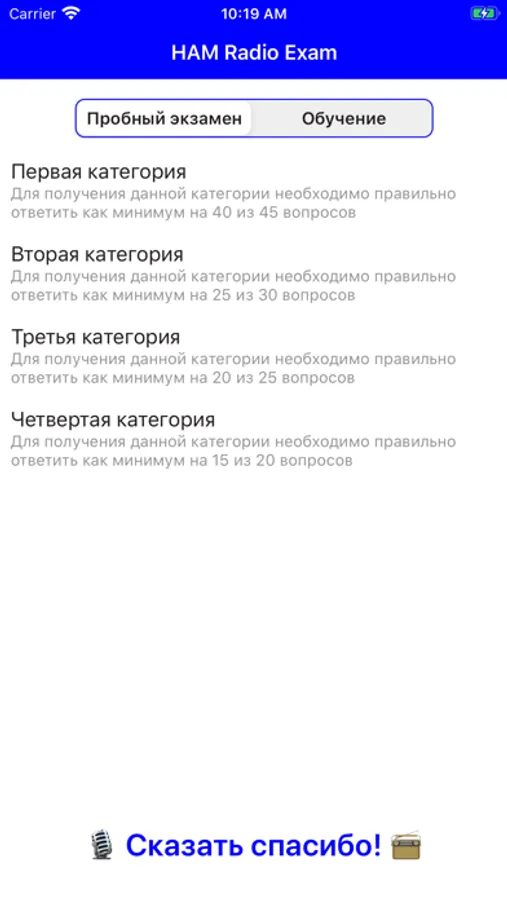 The training mode is a mode with prompts for all possible questions for the selected category. If you do not know the answer, we will help you, if you make a mistake, we will show you the correct answer!
