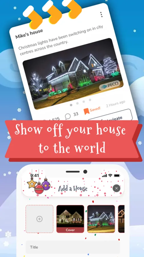 Application! Once we’re in the application, we will be able to view a map with everyone who has Christmas lights in the USA! We can post the lights and see our friends and families put the lights on their houses or go on an adventure and see the lights all around us!