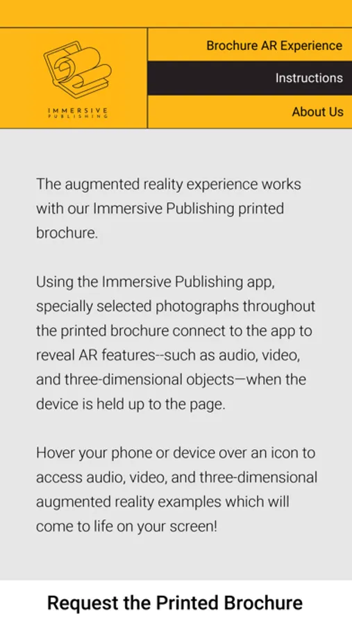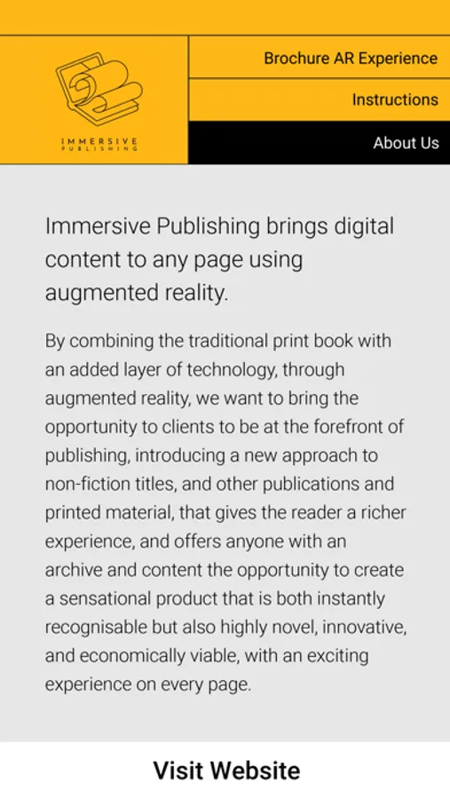 Immersive Publishing combines the printed page with augmented reality, offering solutions which will allow your customers to enjoy digital content in a new manner. This app works with our printed brochure to show you some of things that AR could do for you. Visit www.immersivepub.com for more information or to request a free brochure.