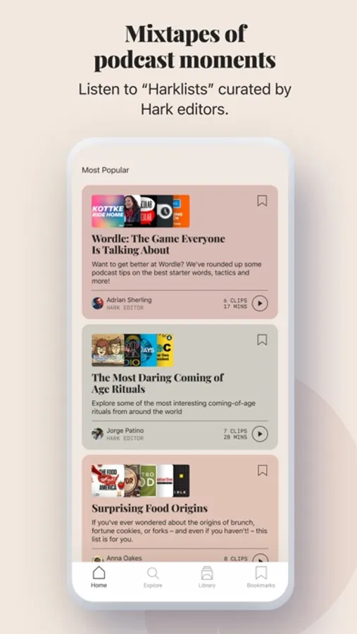 Here’s how it works: Hark editors curate genius podcast moments into ‘Harklists’ - podcast mixtapes - that let you discover new voices, stories, perspectives… and new podcasts!
