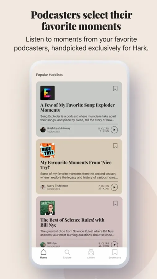 Experience “Curated by Podcasters” Harklists, created by the hosts of favorite podcasts like Song Exploder, Nice Try and Rough Translation.