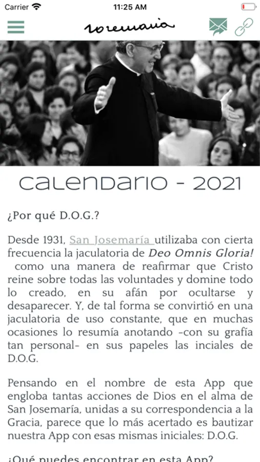 De hecho, desde 1931 San Josemaría utilizaba con cierta frecuencia la jaculatoria de Deo Omnis Gloria! (Para Dios toda la Gloria!) como una manera de reafirmar que Cristo reine sobre todas las voluntades y domine todo lo creado, en su afán de ocultarse y desaparecer. Y de tal forma se convirtió en una jaculatoria de uso constante, que en muchas ocasiones lo resumía anotando en sus papeles -con su grafía tan personal- las iniciales de D.O.G. De ahí que lo hayamos elegido como nombre de nuestra App.