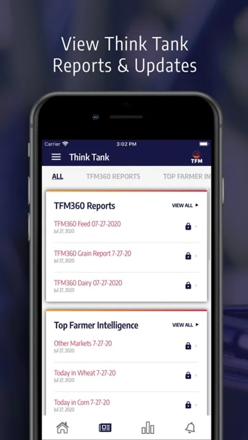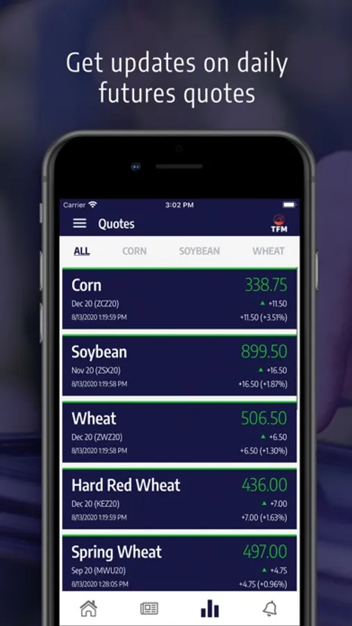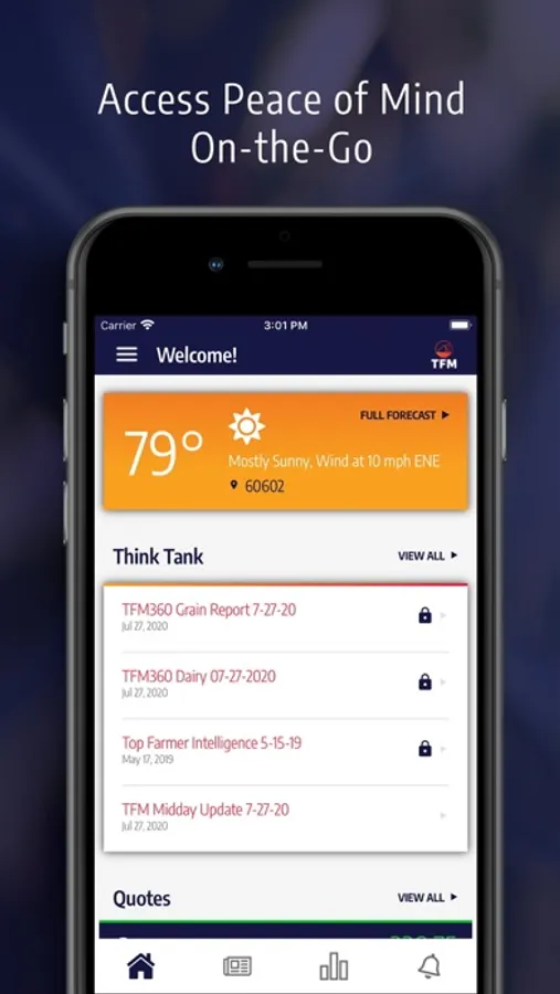 TFM Mobile by Total Farm Marketing enables producers and farmers to stay updated on-the-go with the latest commodity quotes and charts for Corn, Soybeans, Soybean Meal, Wheat, Live Cattle, Feeder Cattle, Lean Hogs, and Milk. In addition to local weather and national NOAA Radar maps, the app delivers daily insight and commentary from the TFM Think Tank, including Sunrise and Mid-Day Updates, TFM360 Livestock reports, TFM Top Farmer Intelligence, This Week in Commodities, News & Announcements, and more. TFM Mobile includes access to free daily commentary for all users, in addition TFM360 & TFM Top Farmer Intelligence subscribers will enjoy easy access to exclusive commentary.