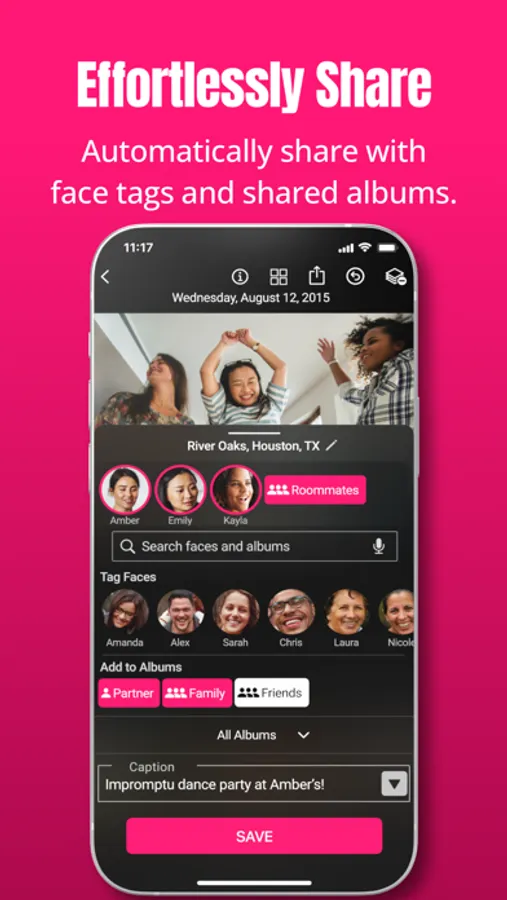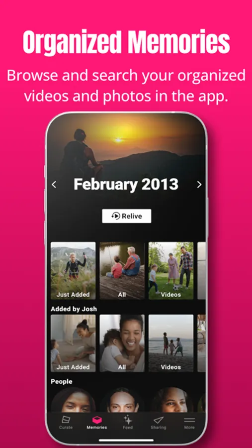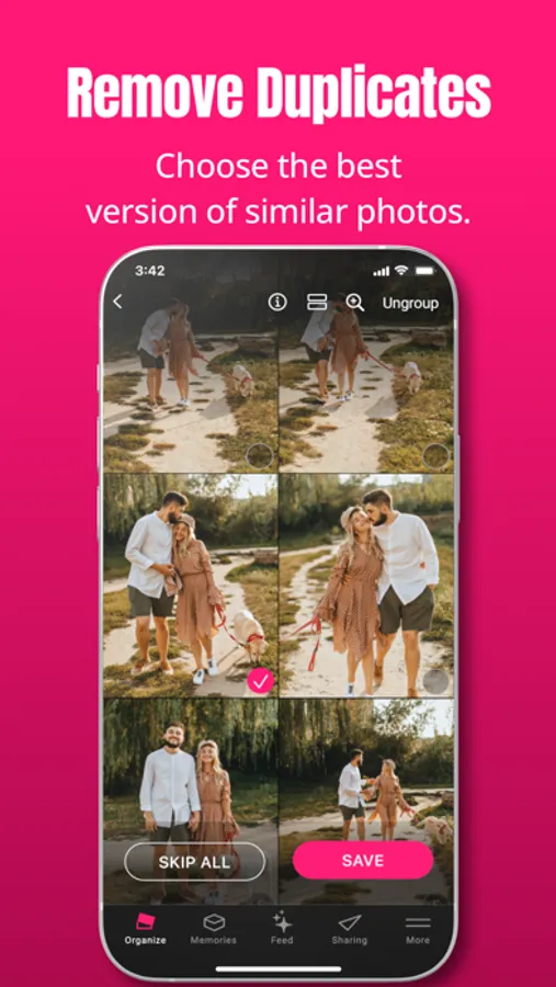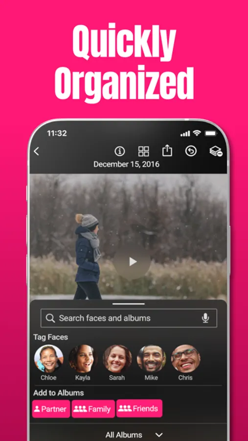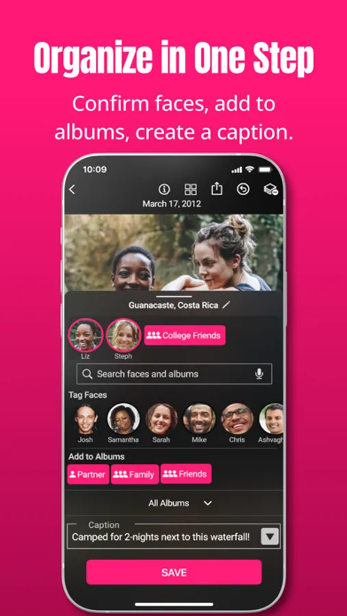 Organizing your photos and videos is a breeze. Simply skip or save each image. When you save, you can easily: