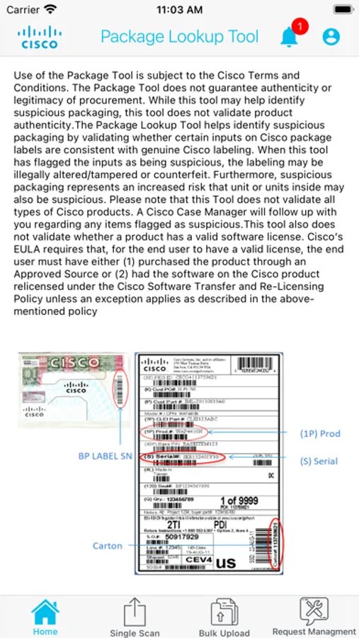 The Cisco Product Verifier helps identify suspicious packaging by validating whether certain inputs on Cisco package labels are consistent with genuine Cisco labeling. When this tool has flagged the inputs as being suspicious, the labeling may be illegally acquired or tampered.