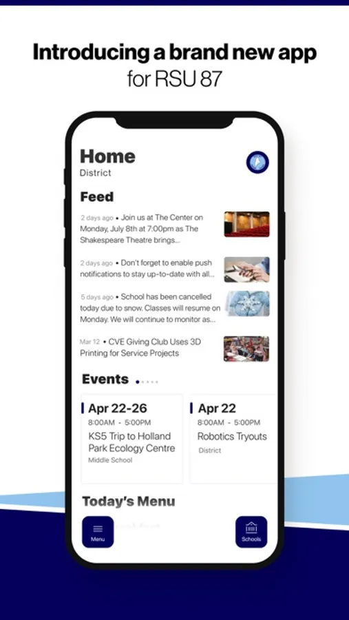 The official app for RSU 87, ME allows users direct access to the most recent news, announcements and event calendars. Customize the app to display information relevant to a specific campus and to receive important notifications from the district. Users may also access the directory of district faculty and staff, view dining menus, find the location of district events, contact campuses and departments, follow athletic scores and updates, and much more.