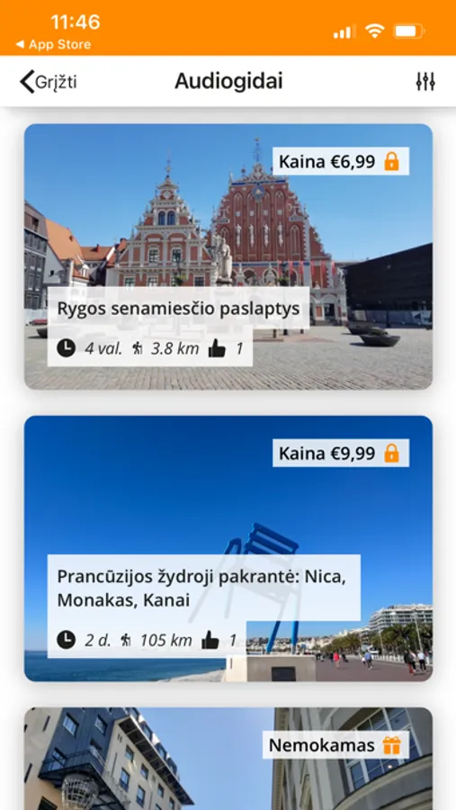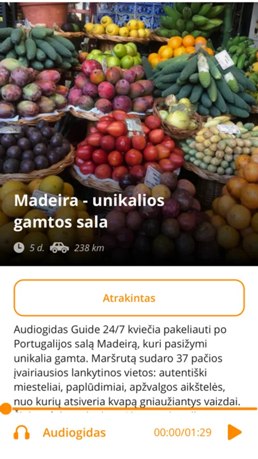 Atsisiųskite programėlę į telefoną, pasirinkite lietuvių kalbą, išbandykite nemokamą maršrutą po Gedimino prospektą Vilniuje. Programėlė automatiškai nustatys jūsų buvimo vietą ir nurodys šalia esančias lankytinas vietas. Mobiliojoje programėlėje rasite keliaujant išbandytus maršrutus bei audiogidus po užsienio miestus bei šalis pėsčiomis, automobiliu ar dviračiu. Tavęs audiogidas laukia Madeiroje, Škotijoje, Edinburge, Kretos ir Rodo salose, Rygoje, Taline, Provanse, Žydrojoje Pakrantėje bei kitose turistų pamėgtose vietose. Audiogide lankytinos vietos yra suskirstytos pagal temas (archeologija, istorija, gamta, degustacija ir t. t.). Todėl patys galite pasirinkti, kokias vietas ar šalį norite aplankyti. O patikusį maršrutą galėsite nesudėtingai įsigyti.