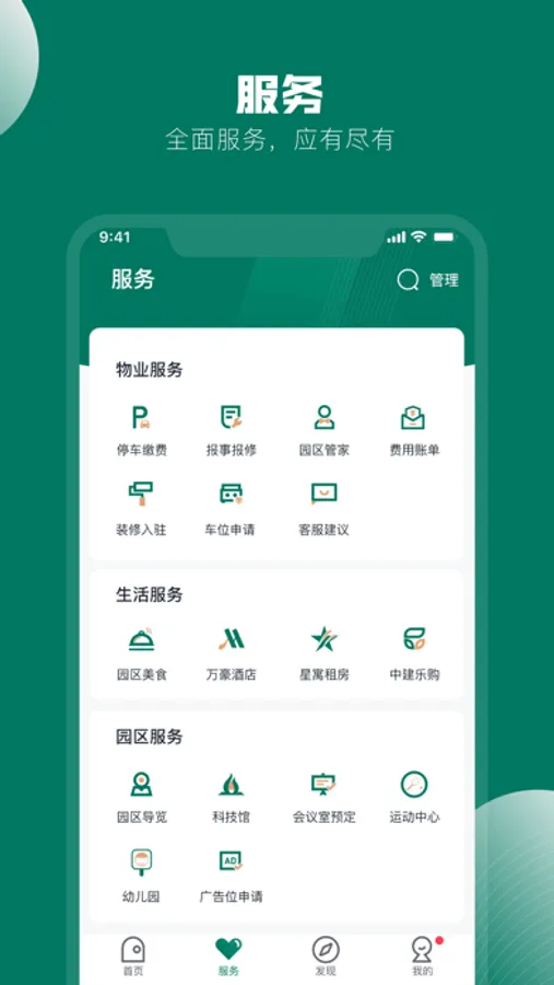 围绕园区工作、生活、娱乐、购物、休闲为园区入驻企业及企业员工提供全面服务,包括园区导览、线上看房、建筑科技馆、星街、运动中心、会议中心、星寓租房等全方面服务。
