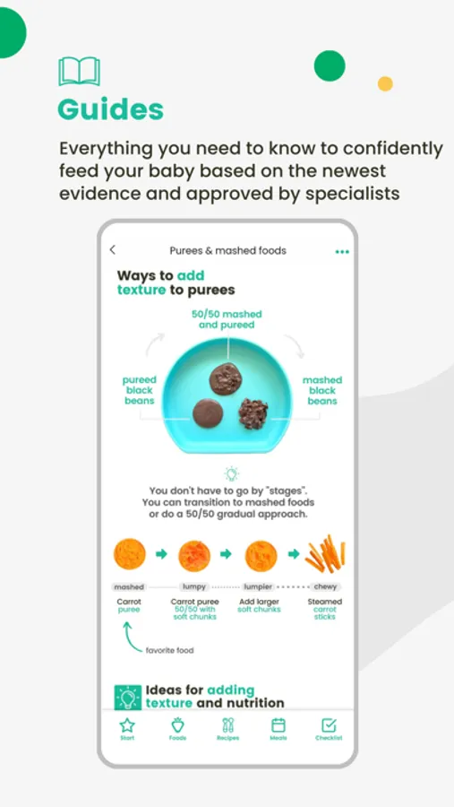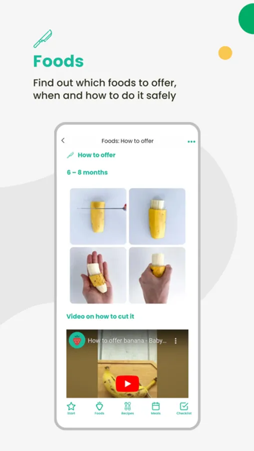 • A baby food library with photos, videos, and tips on how to cut and prepare food safely for your baby.
