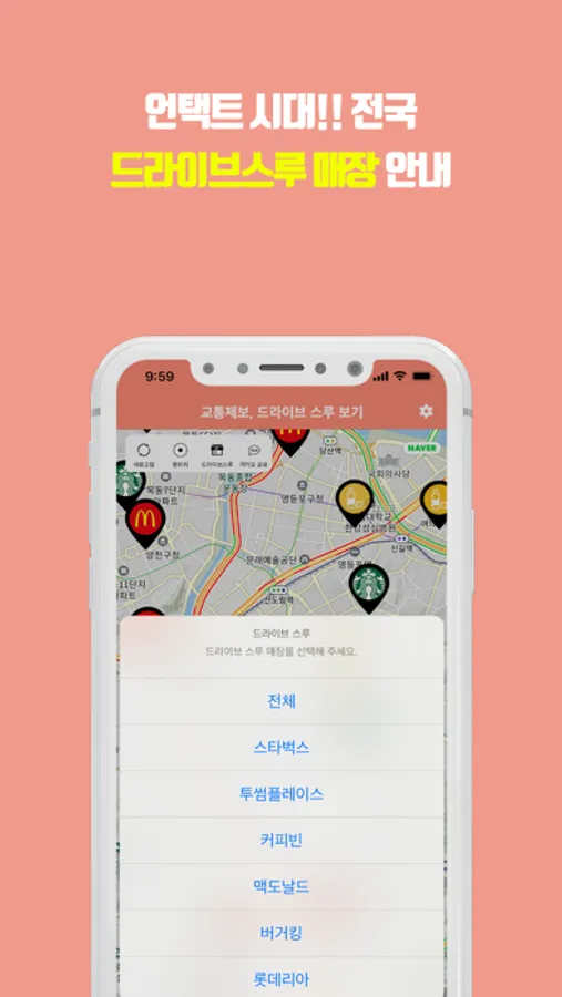 언택트 시대에 맞게 전국 드라이브 스루 매장을 추가하였습니다.