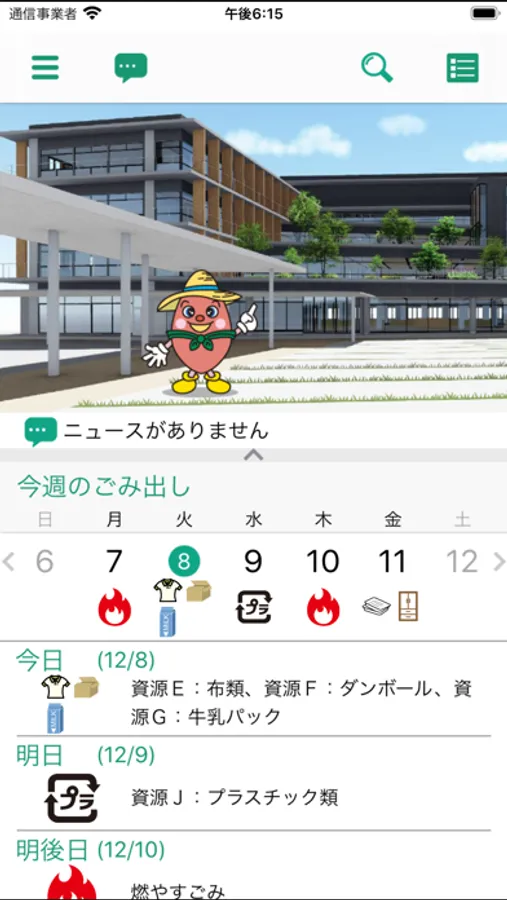 収集日変更のお知らせやイベント情報などを確認することができます。