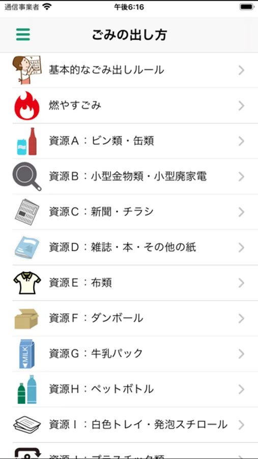 ごみの種別ごとに、主な品目と出し方を確認することができます。