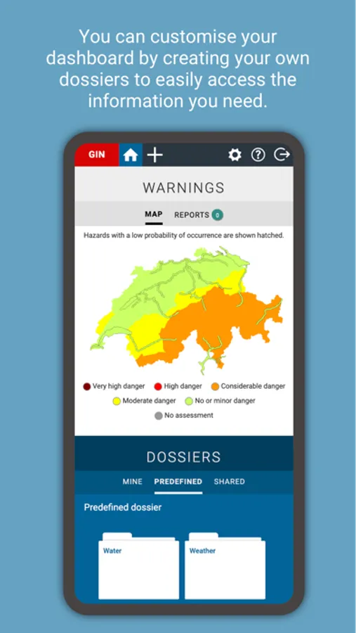 The federal agencies that deal with natural hazards use the Common Information Platform for Natural Hazards (GIN) to share information on natural hazards with other experts at federal, cantonal and communal levels. This information includes measurements and observation data, forecasts, warnings, models and bulletins.