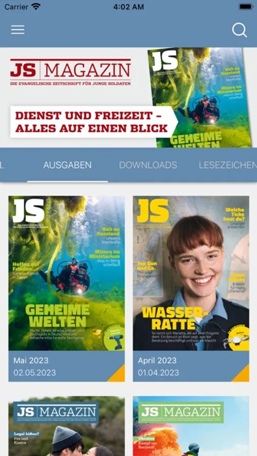 JS-Magazin ist die App des gleichnamigen Magazins, das an Standorten der Bundeswehr kostenlos ausliegt und das man auch hier ansehen kann: www.js-magazin.de. JS-Magazin richtet sich vor allem an junge Soldaten und Soldatinnen und bietet aktuelle Themen aus der Bundeswehr. Die Redaktion berichtet mit kritischem Blick über den Dienst in Uniform, über Auslandseinsätze und politische Hintergründe. Dazu kommen „zivile“ Themen, die junge Leute interessieren: Sport, Freizeit, Unterhaltung, Liebe, Glauben und einiges mehr.