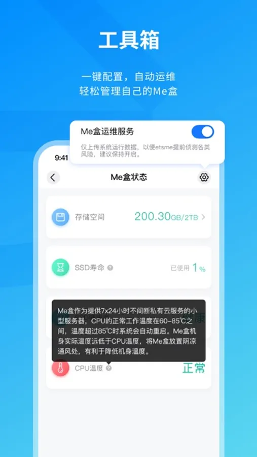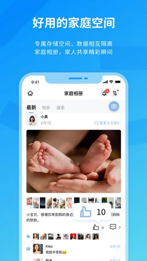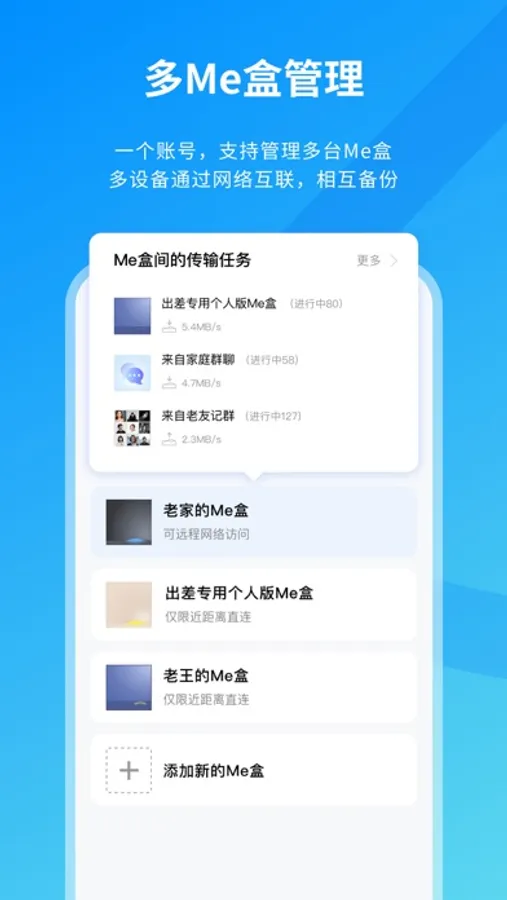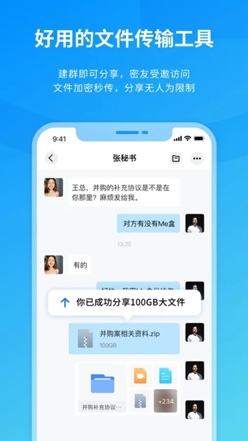 支持Me盒空间共享,给家人提供文件私存服务;支持创建聊天群,在群内和好友,同事共享文件,私密聊天。