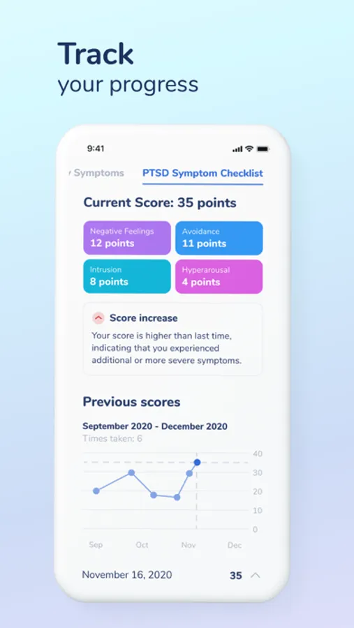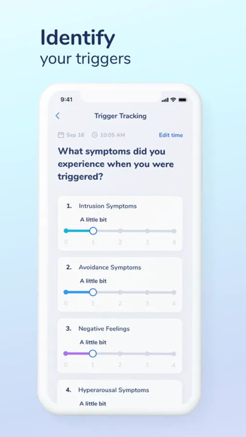 - Daily trigger and symptom tracking, based on PCL-5 questionnaire or PTSD symptom checklist, as developed by the National Center for PTSD