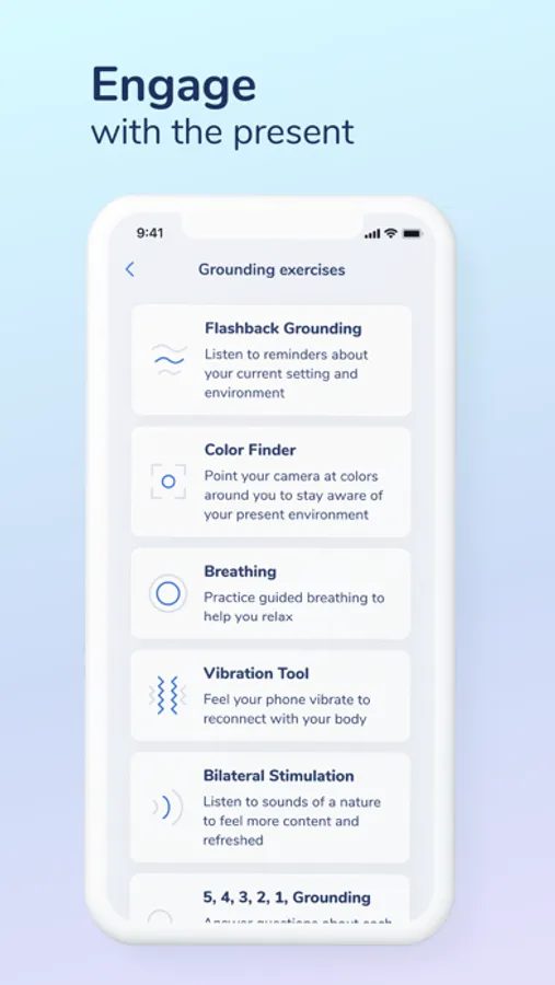 - Grounding exercises with coping techniques that engage with your senses and connect you with the present moment