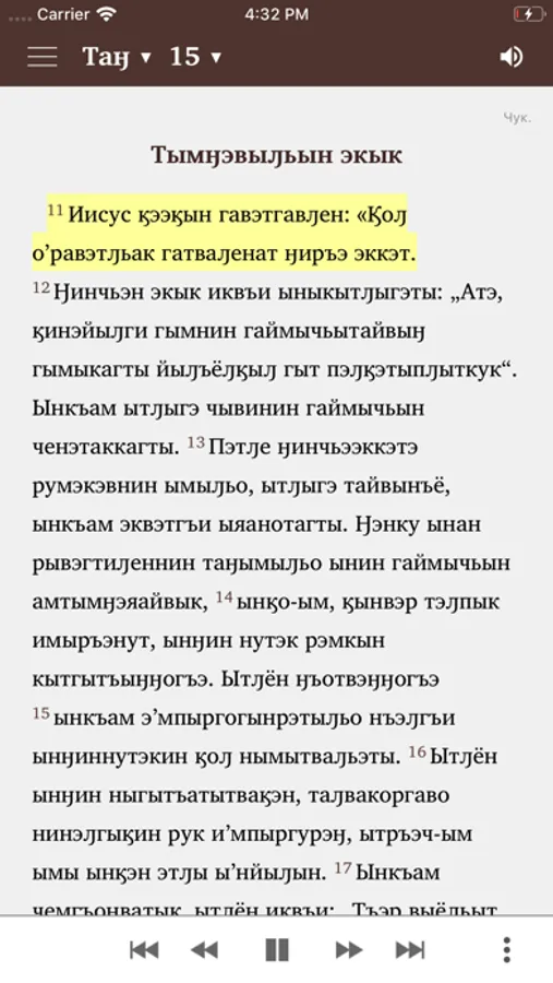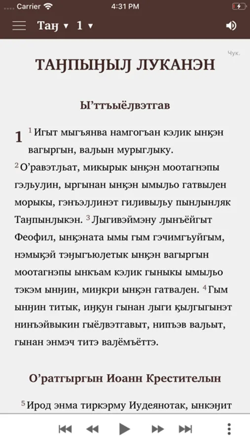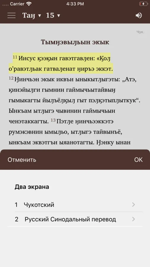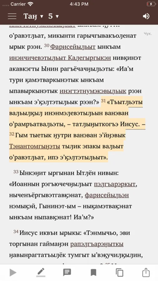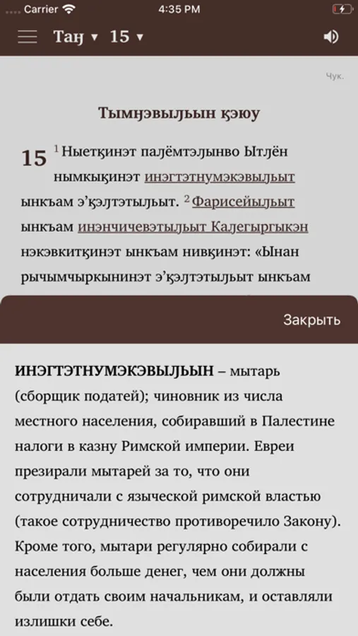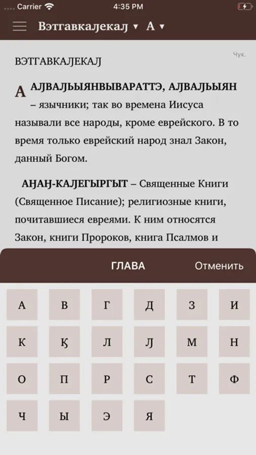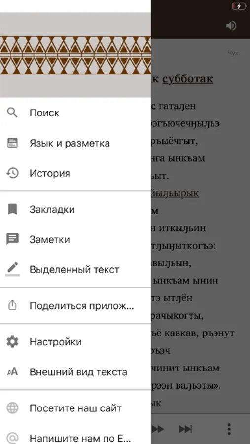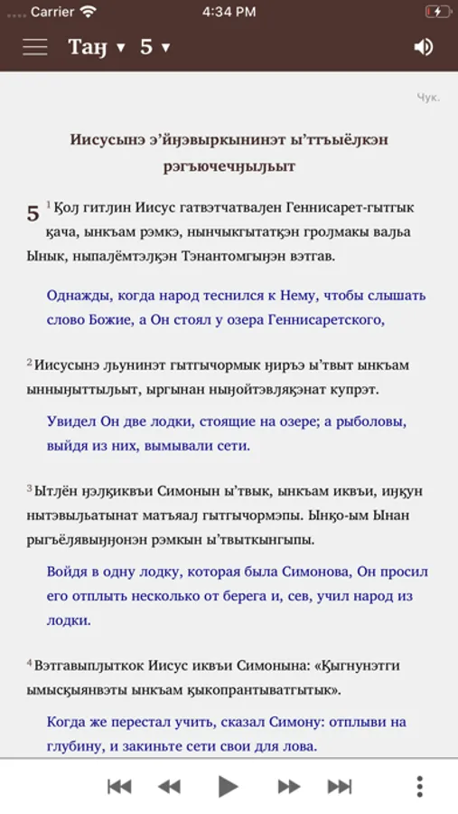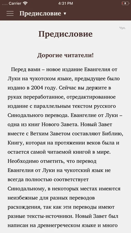 This app facilitates Bible study in the Chukchi language. The Russian Synodal translation can optionally be added in parallel to the Chukchi text. Users can highlight verses in different colors, make bookmarks, write notes and view their reading history.