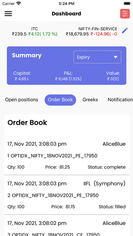 Dashboard : This page gives you a brief PnL summary, the open positions, order book and the notification log.