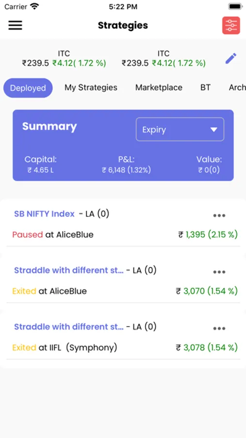 Deployed page : All your deployed strategies are listed here. From the “My strategies” page, Once deployed, the conditions are checked continuously and as any condition is true, the relevant action is taken viz Entry, Repair and Exit of a strategy. In case of any error, once you are notified, you can intervene manually and fix the issue. This page will show you a consolidated view of all your strategies MTM profit and loss and open positions.