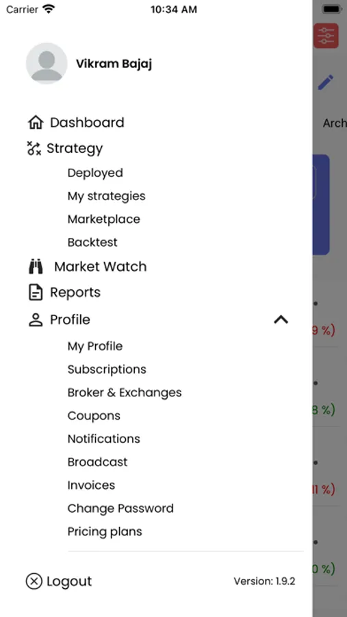 Profile : Here you can configure your broker settings, update profile info and password, manage your TT plan and strategy subscriptions, check your invoices, set notifications and check for various pricing plans