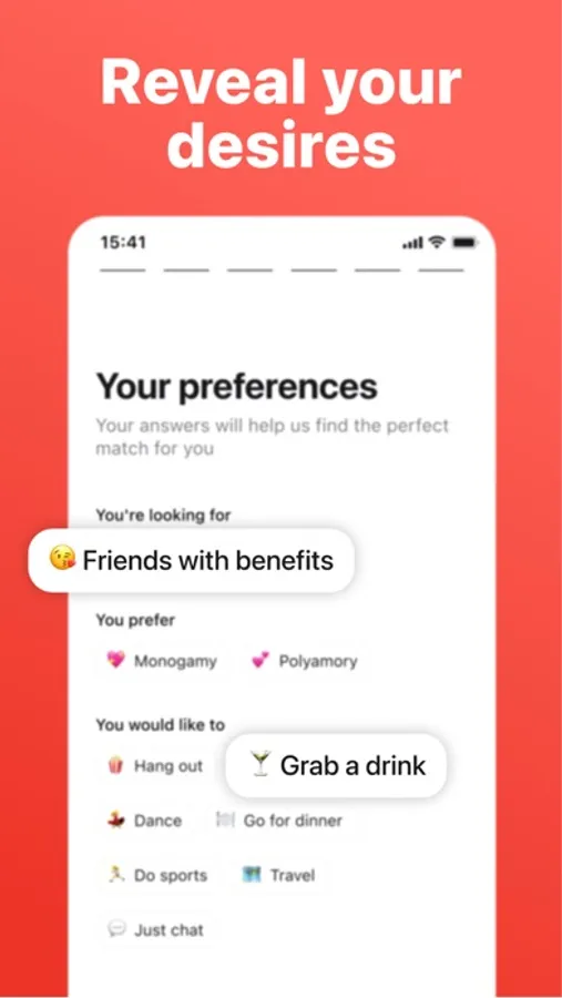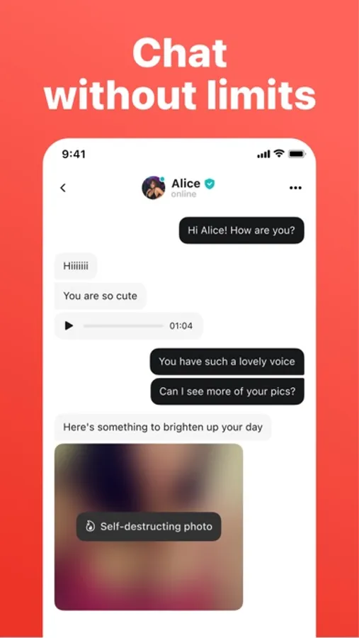 Your chat messages and photos cannot be saved by anybody. We'll notify you and hide the screen if someone tries to record or make a screenshot. Your private messages are being taken care of and will never leave the app.