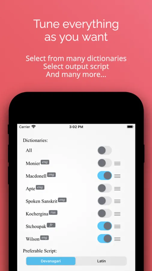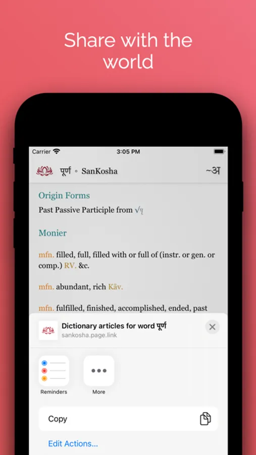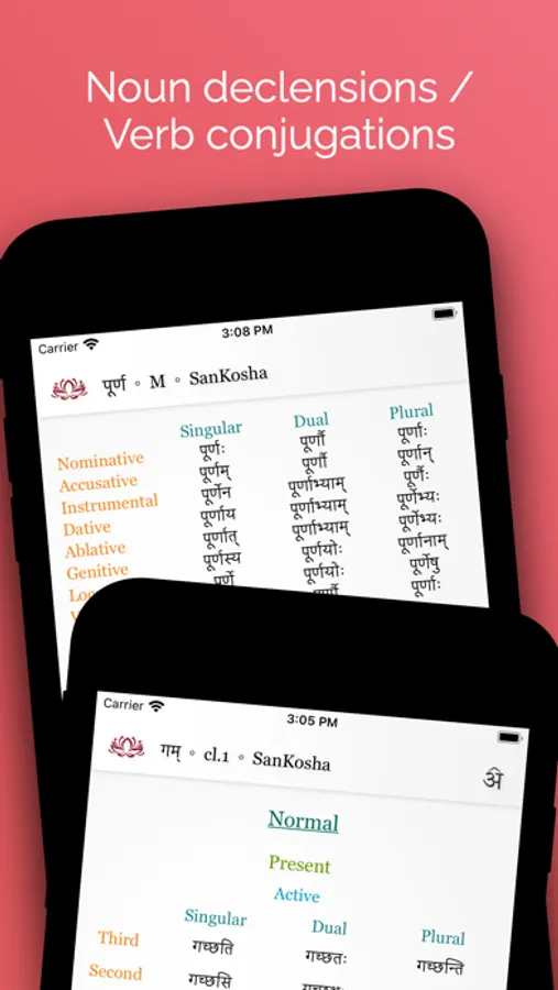 See word articles from dictionaries you prefer. Find original form of the words. Use reverse search to find Sanskrit words with such meaning. Search using devanagari or latin script. See nouns declensions and verbs conjugations. And much more.
