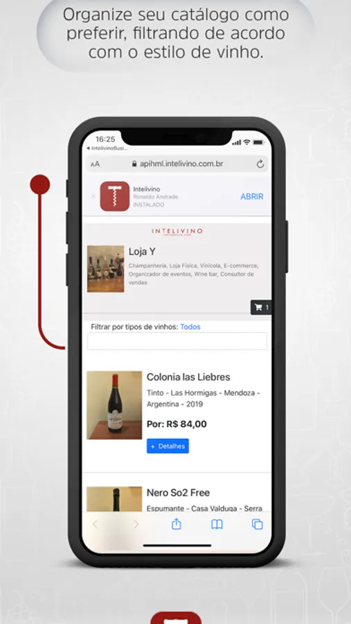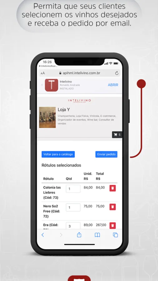 Se você trabalha com venda de vinhos, seja uma loja física, um representante ou um e-commerce, o Intelivino Business é um aplicativo que veio para te ajudar. Através de recursos importantes, é possível fazer o cadastro da sua loja, inserir os rótulos e ter o seu próprio catálogo digital. Sim, chega de enviar aquelas listas no WhatsApp sem formatação, pdfs ou capturas de tela do site. Traga mais facilidade para o seu cliente com um catálogo digital onde ele pode verificar seus vinhos, adicionar ao carrinho e enviar o pedido certo para você. Após isso, chegará no seu email todas as informações necessárias do cliente, o pedido fechado e os canais para contato. Toda a entrega e forma de pagamento pode ser combinada diretamente entre vocês.