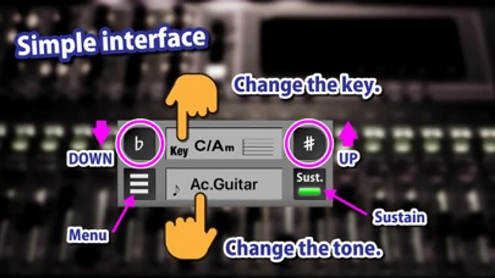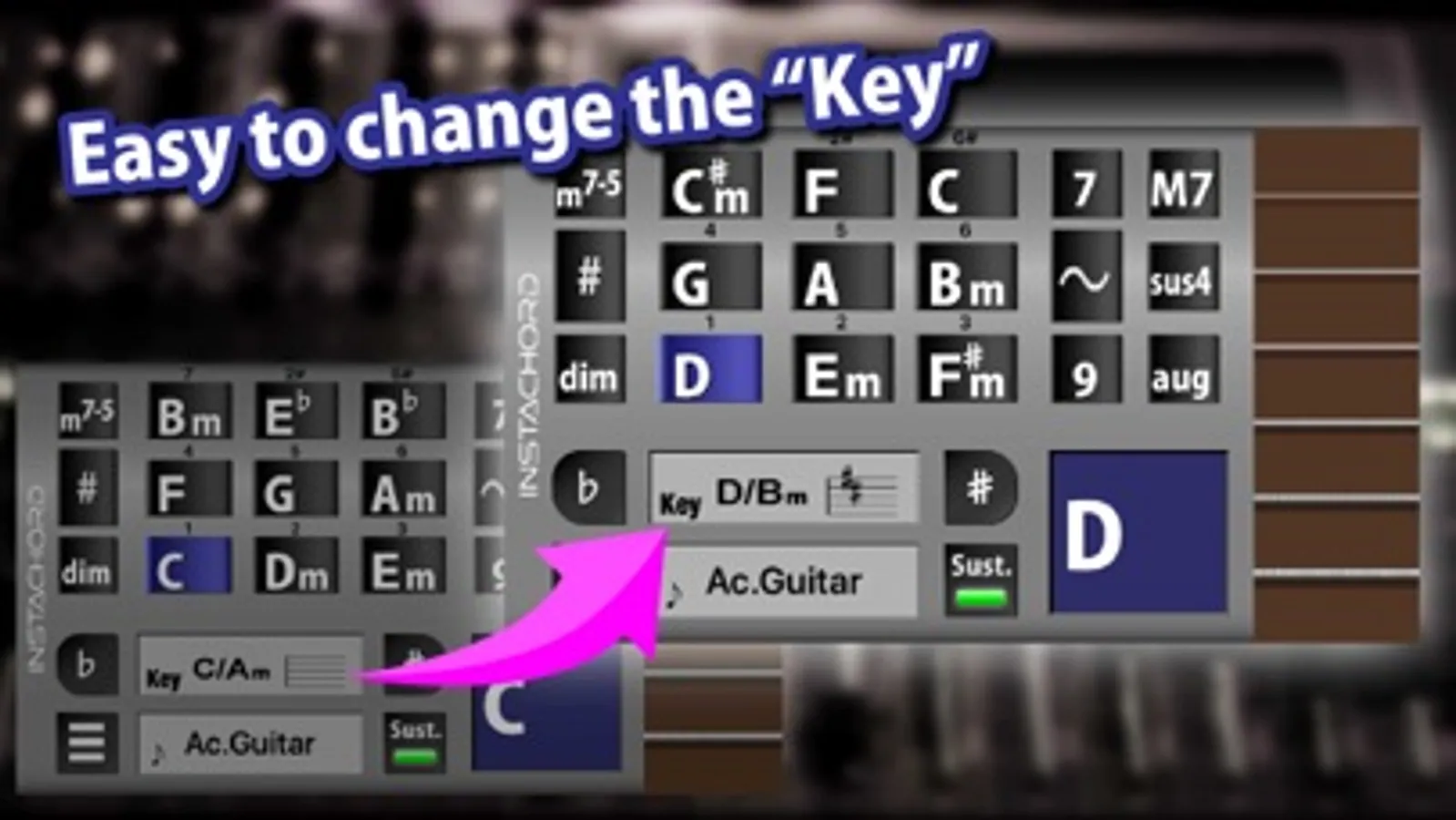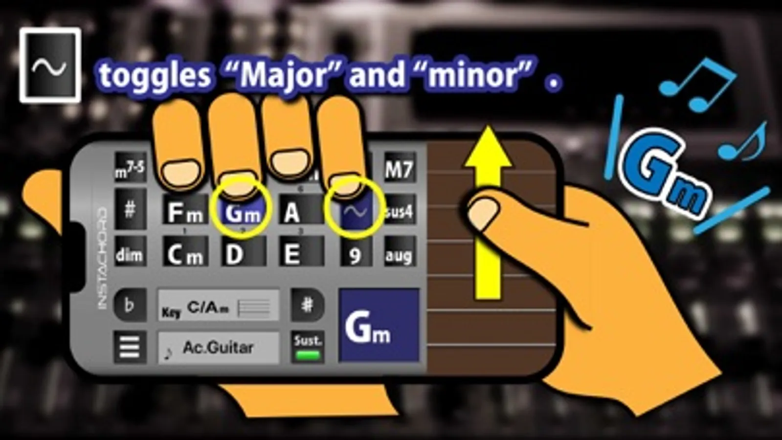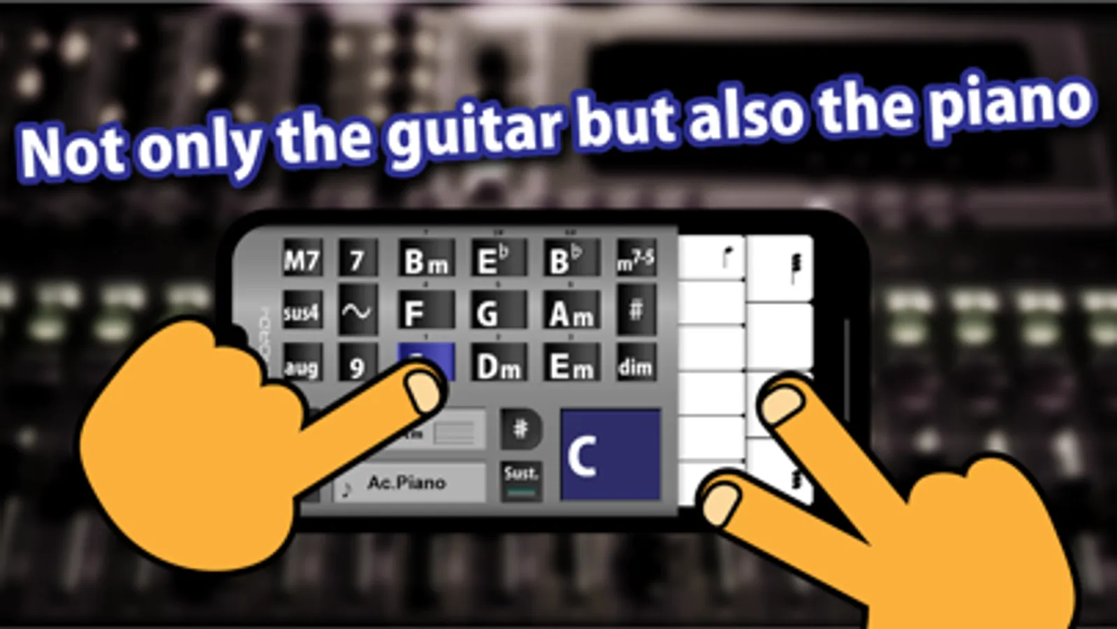 You can enjoy playing like a guitar or piano by tapping and swiping the pads while holding down the buttons with the chord symbols (C, Dm, etc.).