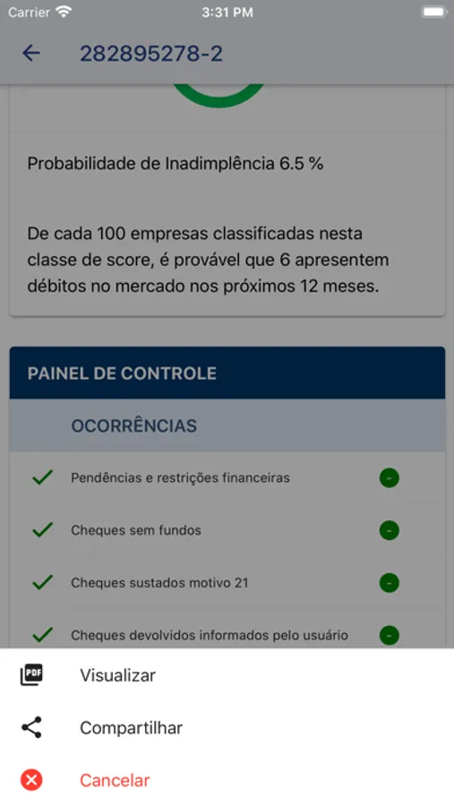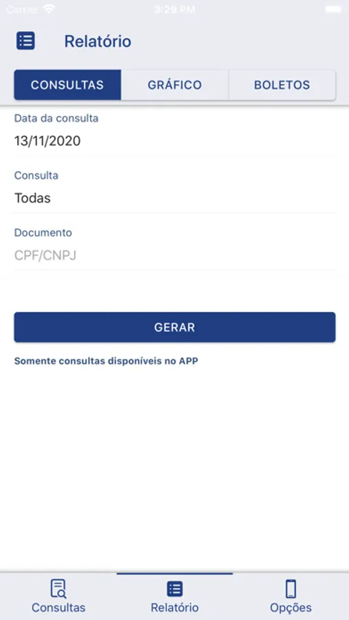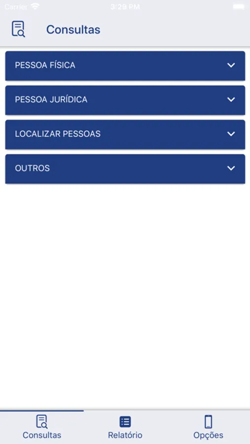 O aplicativo possui as seguintes opções de consultas: Pessoa Física, Pessoa Jurídica, Cheques e Veículos. Além dessas consultas, é possível verificar a situação cadastral na base de dados da Receita Federal de CPF e CNPJ.