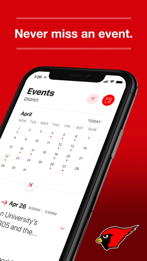 The event section shows a list of events throughout the district. Users can add an event to their calendar to share the event with friends and family with one tap.
