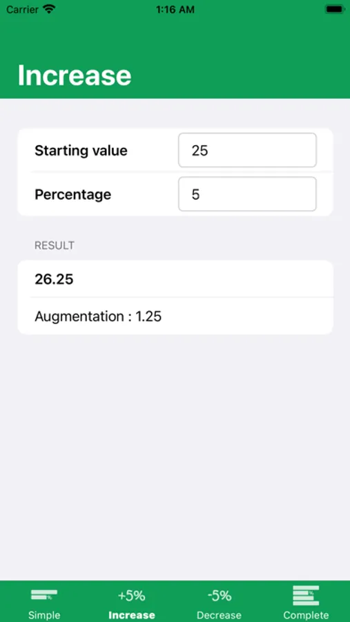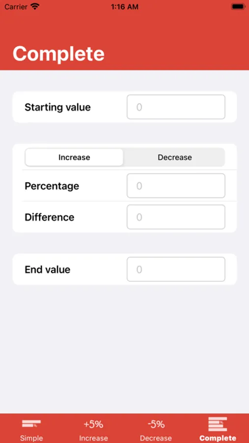 The app can calculate the start value, a percentage, the difference or the end value.