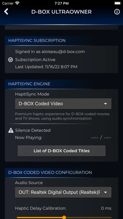 This app lets you adjust your D-BOX HaptiSync System to enjoy your haptic immersive experience at home exactly as you want. Manage your haptic seat settings by customizing the intensity of movement and vibration levels.